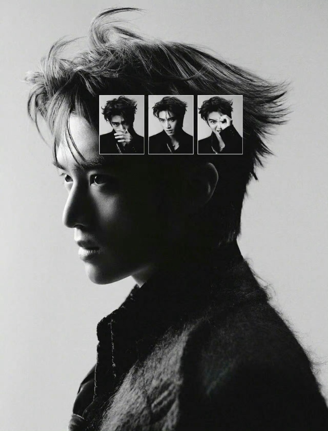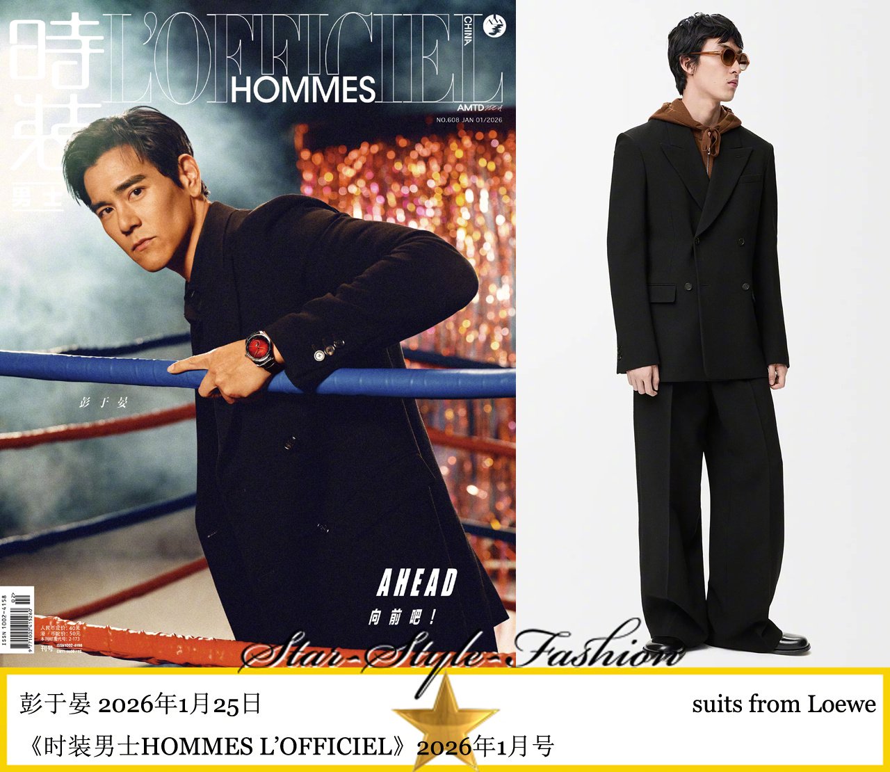 彭于晏分别身着loewe黑色双排扣套装和emporio armani2025秋冬男士系列咖色印花皮大衣登《时装男士》2026年1月号双封面...