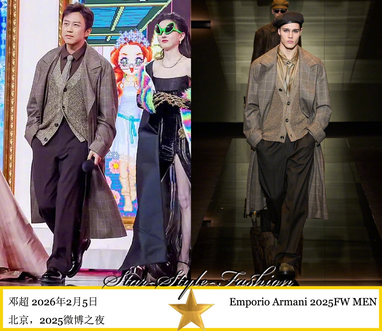 邓超身着emporio armani2025秋冬男士系列灰色格纹大衣装亮相...