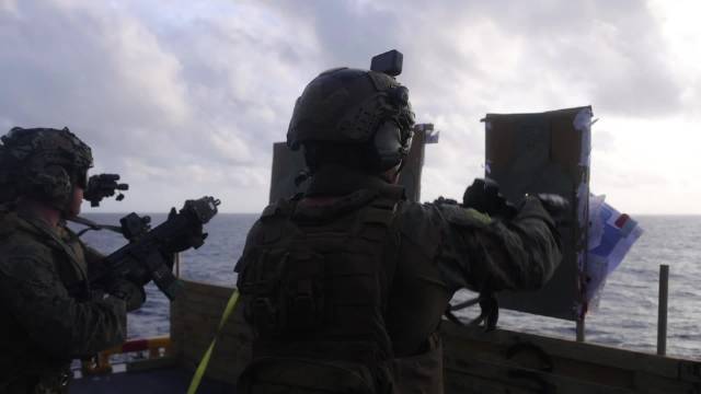 2023年12月8日,在日本冲绳海岸,美国海军陆战队与海军陆战队第31远征部队的海上突袭部队进行了访问,登船,搜索和扣押训练,太阳落在霍珀号(DDG 70)旁边...