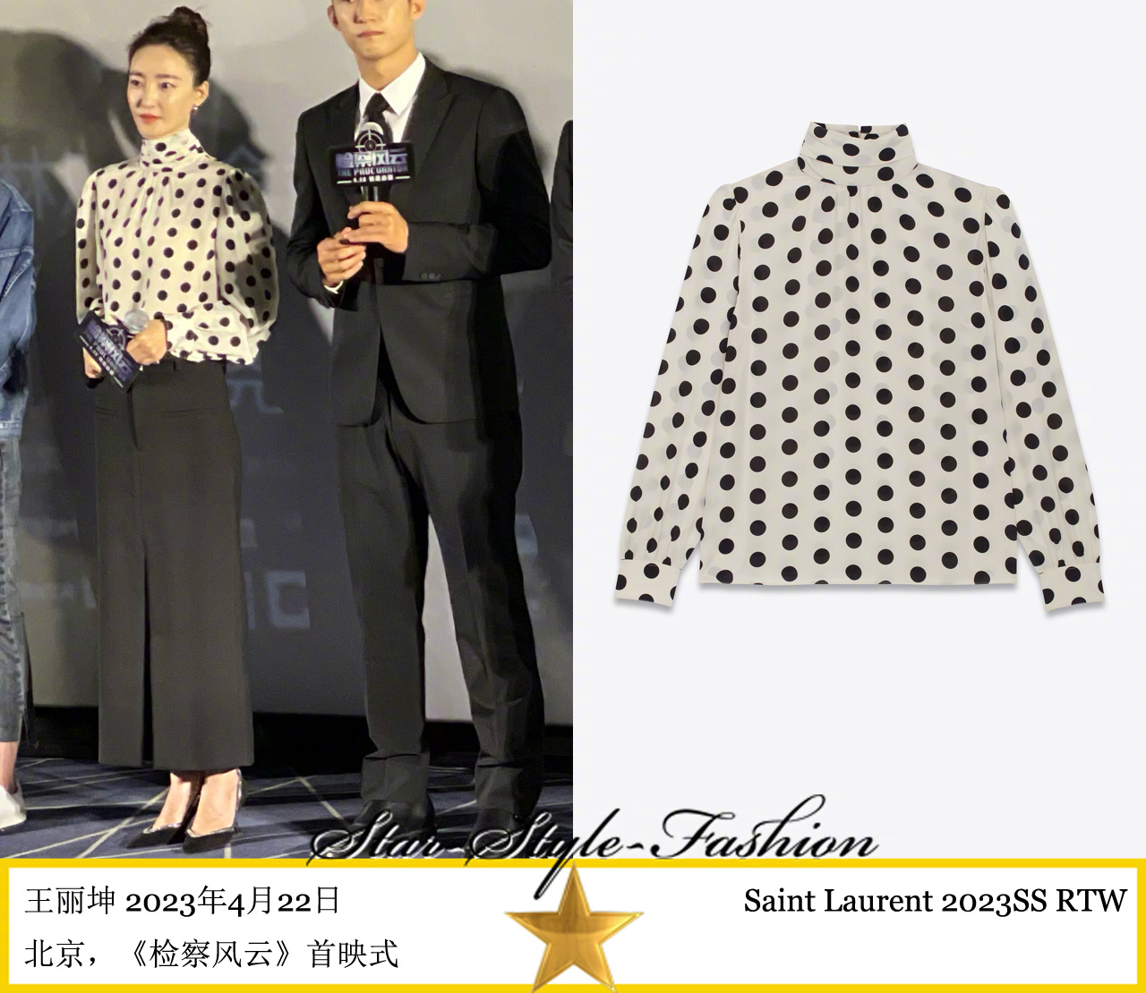 王丽坤身着saint laurent2023春夏系列黑白波点双层绉纱上衣亮相
