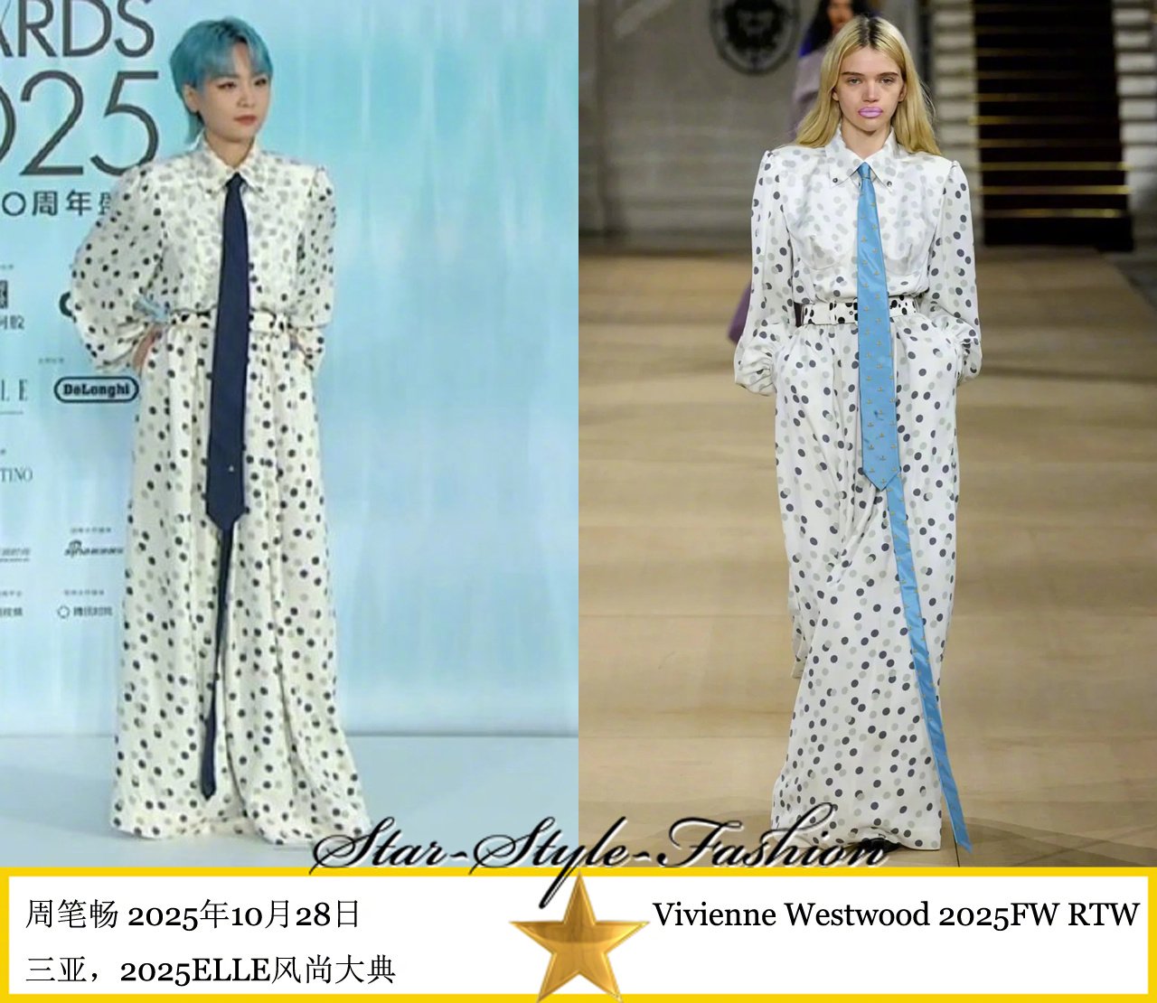 周笔畅身着vivienne westwood2025秋冬系列黑色波点白色衬衫长裙装亮相。为何要把天蓝色领带换成黑色。本来可以和发色呼应的[笑cry]...