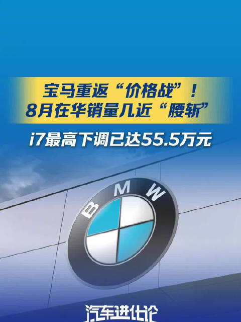 #宝马因销量重返价格战#宝马8月在华销量几近“腰斩”,i7最高下调已达55.5万元。业内人士普遍认为,宝马重返“价格战”,受近期销量暴跌、市场压力、前期涨价策略失败以及市场竞争激烈等多重因素影响...