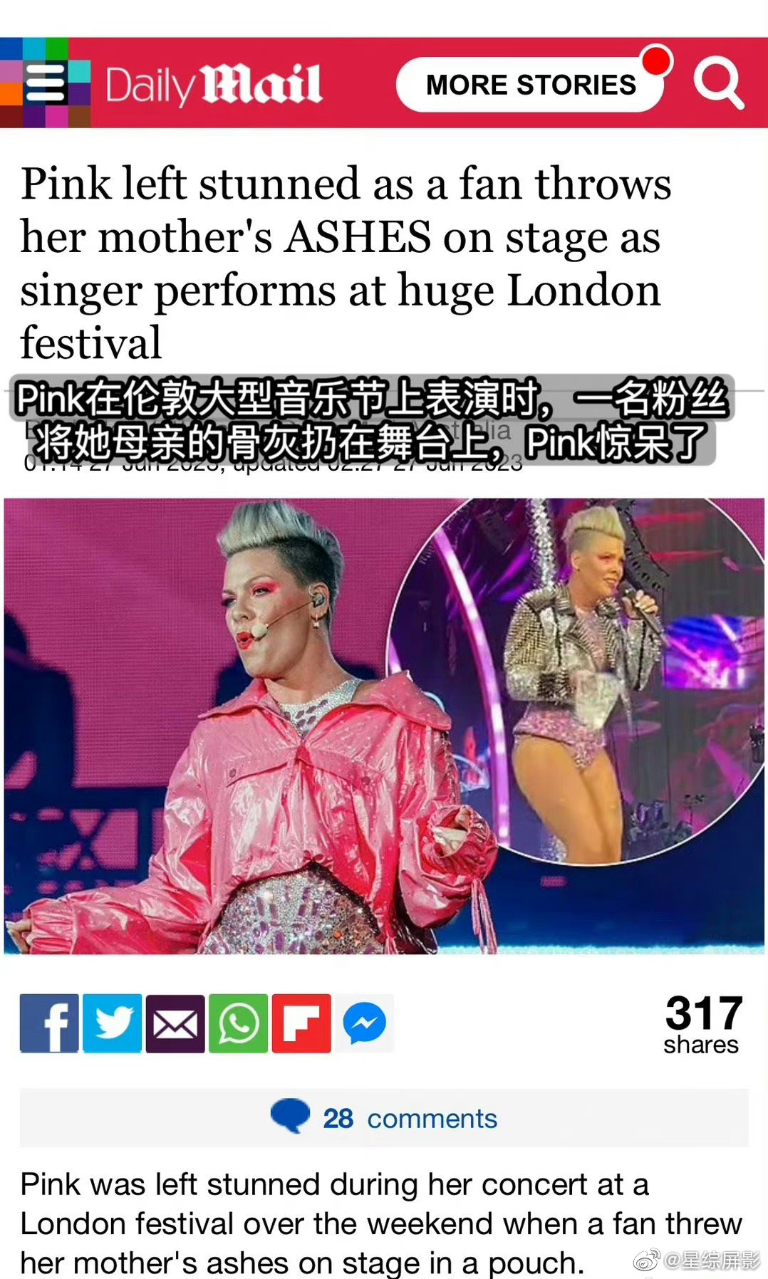 #粉丝将母亲骨灰扔在pink舞台上#Pink在舞台上表演时,有粉丝将母亲骨灰扔在舞台上,不止Pink,我也惊呆了...