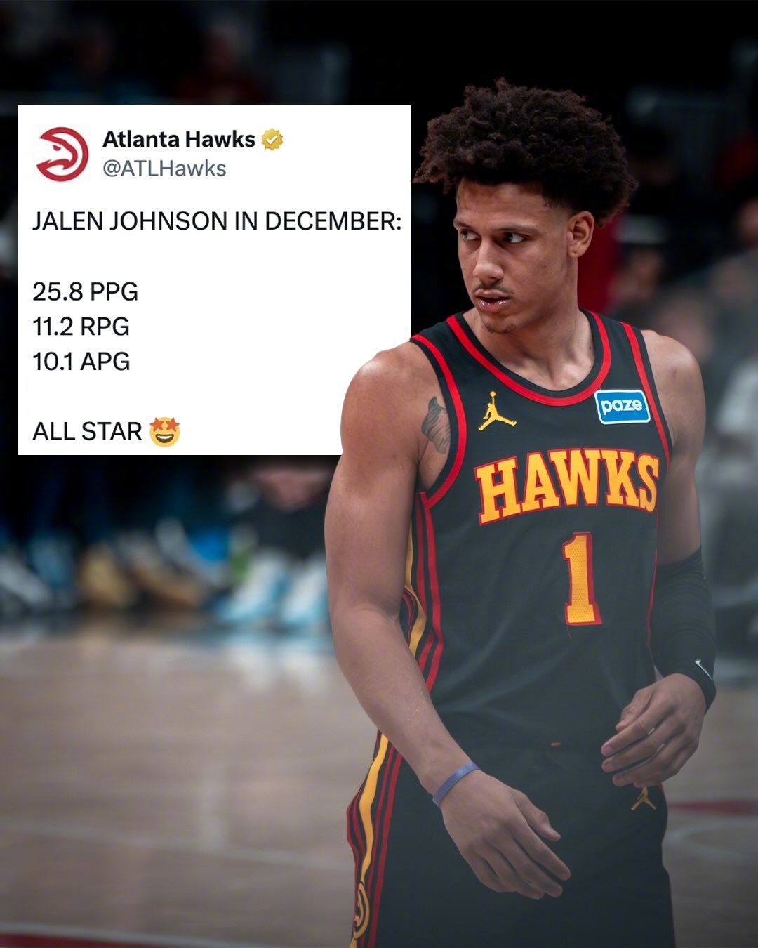 杰伦-约翰逊12月份场均三双25.8分11.2篮板10.1助攻。他也成为NBA历史第7个单月场均砍下25分三双的球员...