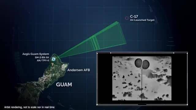 美国关岛弹道导弹拦截试射:一枚SM-3 Block IIA首次用其大气外KKV直接命中由C-17在空中发射的中程弹道导弹,该导弹由AN/TPY-6雷达端到端引导...