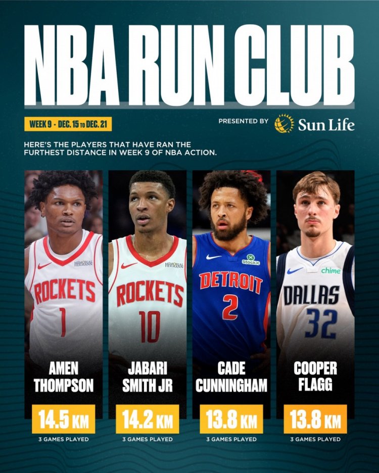 赛季第九周(12月16日-22日)联盟跑动距离最长的球员(均出战3场比赛):阿门 14.5公里小贾巴里·史密斯 14.2公里康宁汉姆 13.8公里弗拉格 13.8公里【来源:直播吧】...