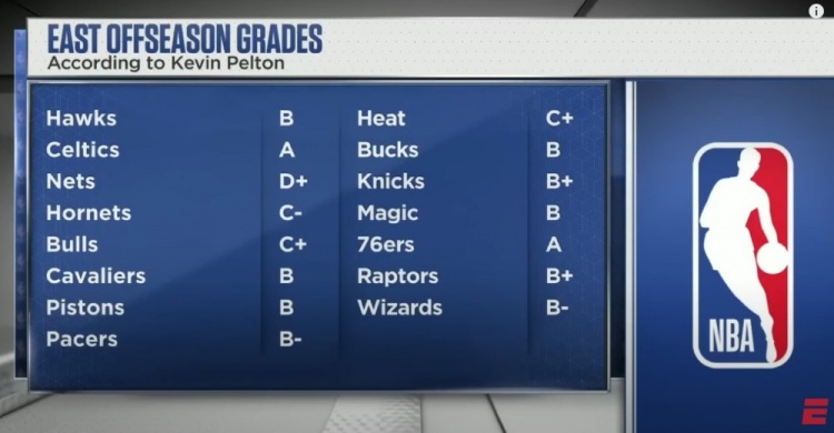 直播吧8月8日讯 近日,美记NBA专栏作家Kevin Pelton晒出了他对东部球队休赛期操作的评级,其中绿军与76人均为A,而篮网则为D+...