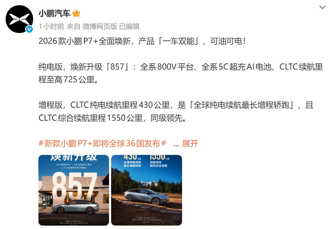 小鹏汽车将发布新款P7+,增程版续航将达1550公里