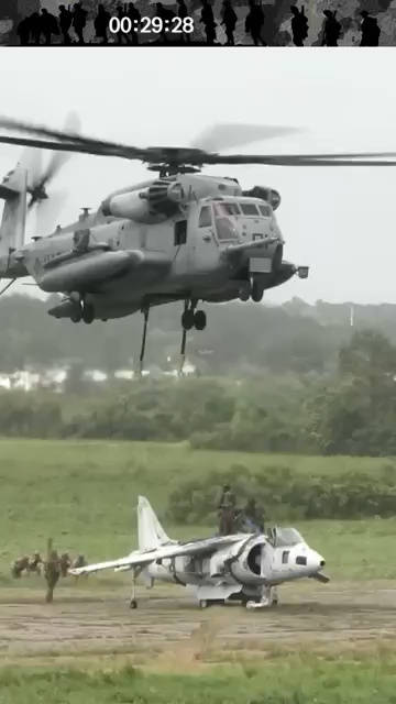 CH-53E直升机吊起AV-8B鹞攻击机……