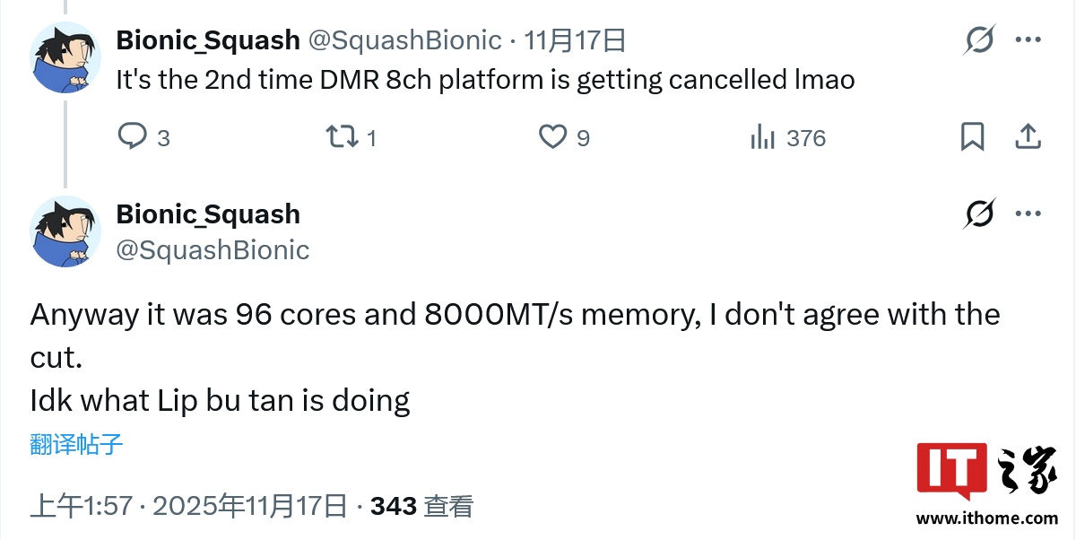 IT之家 11 月 27 日消息,英特尔本月早些时候表示该企业已经取消了至强 7 性能核处理器 "Diamond Rapids" 的 8CH 八内存通道版本...