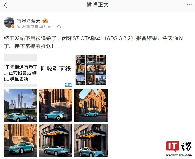 ”该产品总监分享的图片显示,智界 S7 的 8 款车型均已通过审核,下午先向直通车用户和 VIP 用户进行推……...