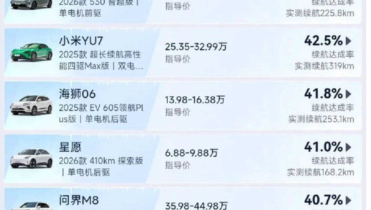 50款车续航冬测:小鹏P7第一!启源A06、Model Y、i8倒数