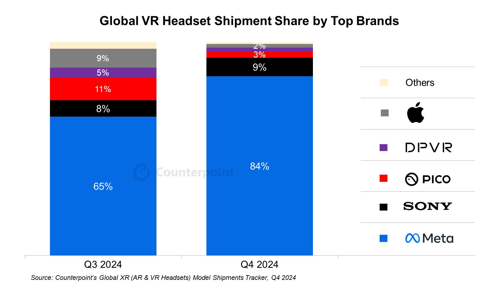 CounterPoint 报告 2024Q4 全球 VR 头显出货量:Meta 84% 一骑绝尘