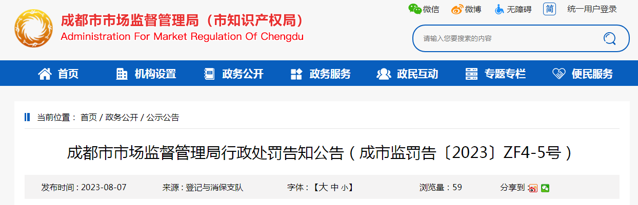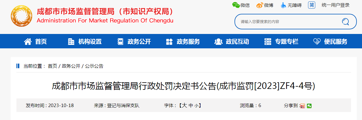 成都市市场监督管理局行政处罚决定书公告(成市监罚[2023]ZF4-4号)