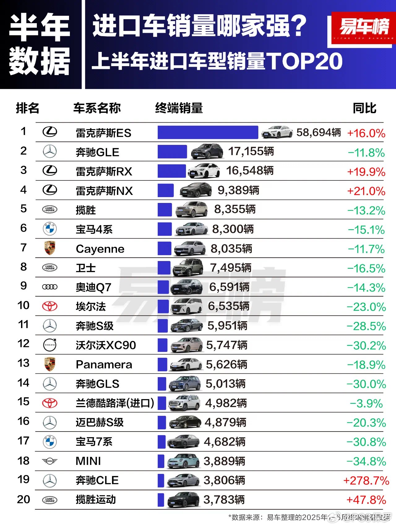 上半年汽车进口前三ES、GLE、RX,出口前三宋、名爵ZS、瑞虎5x