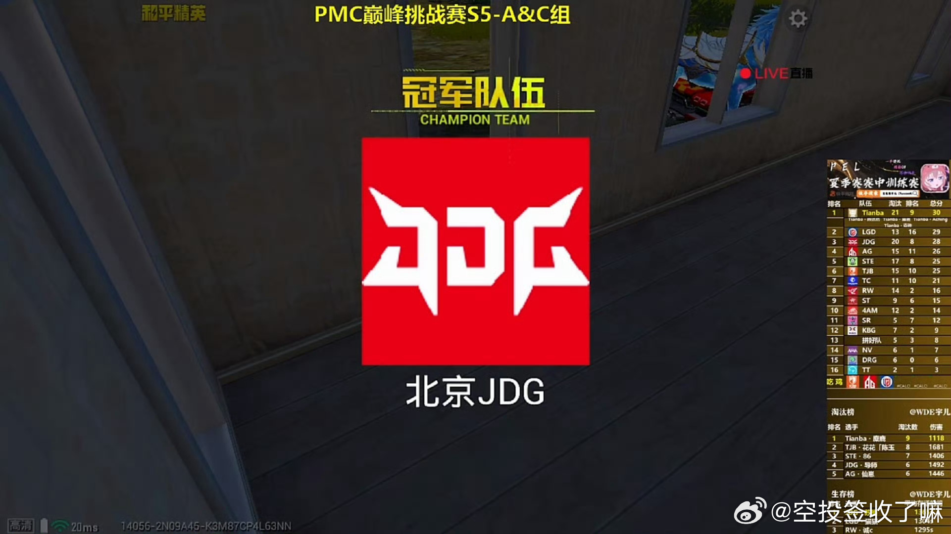 PMC S5 AC组晚间场 战报 积分榜第一:@北京JDG和平精英分部 淘汰榜第一