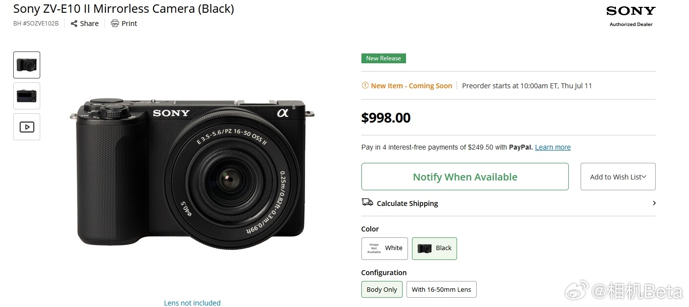 索尼 ZV-E10 II白色版和搭配16-50mm OSS II套机也来了,套机价格1098美元…