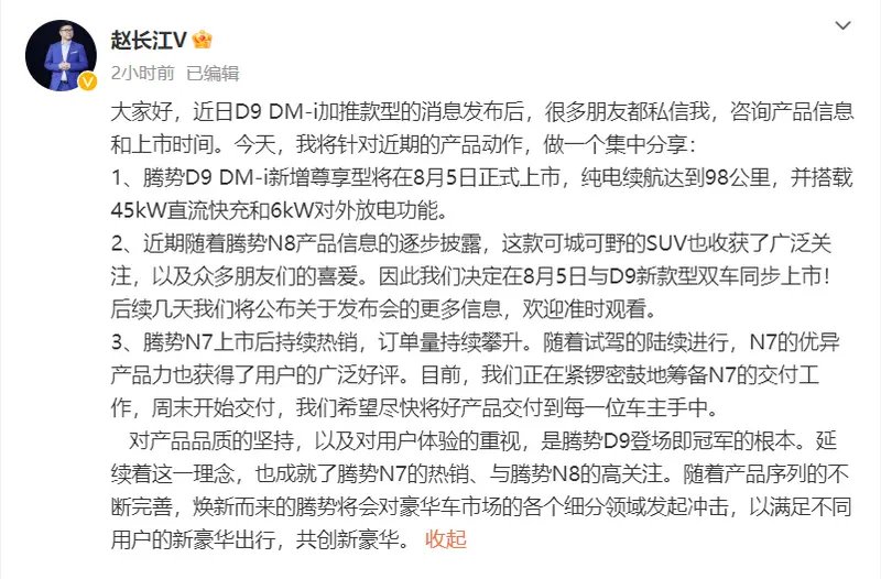 腾势N8将于8月5日上市 D9 DM-i新车型一同推出