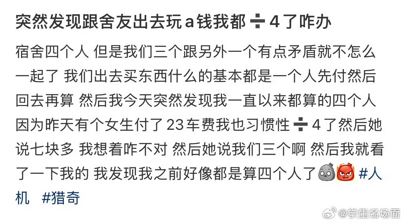 突然发现跟舍友出去玩a钱我都➗4了咋办