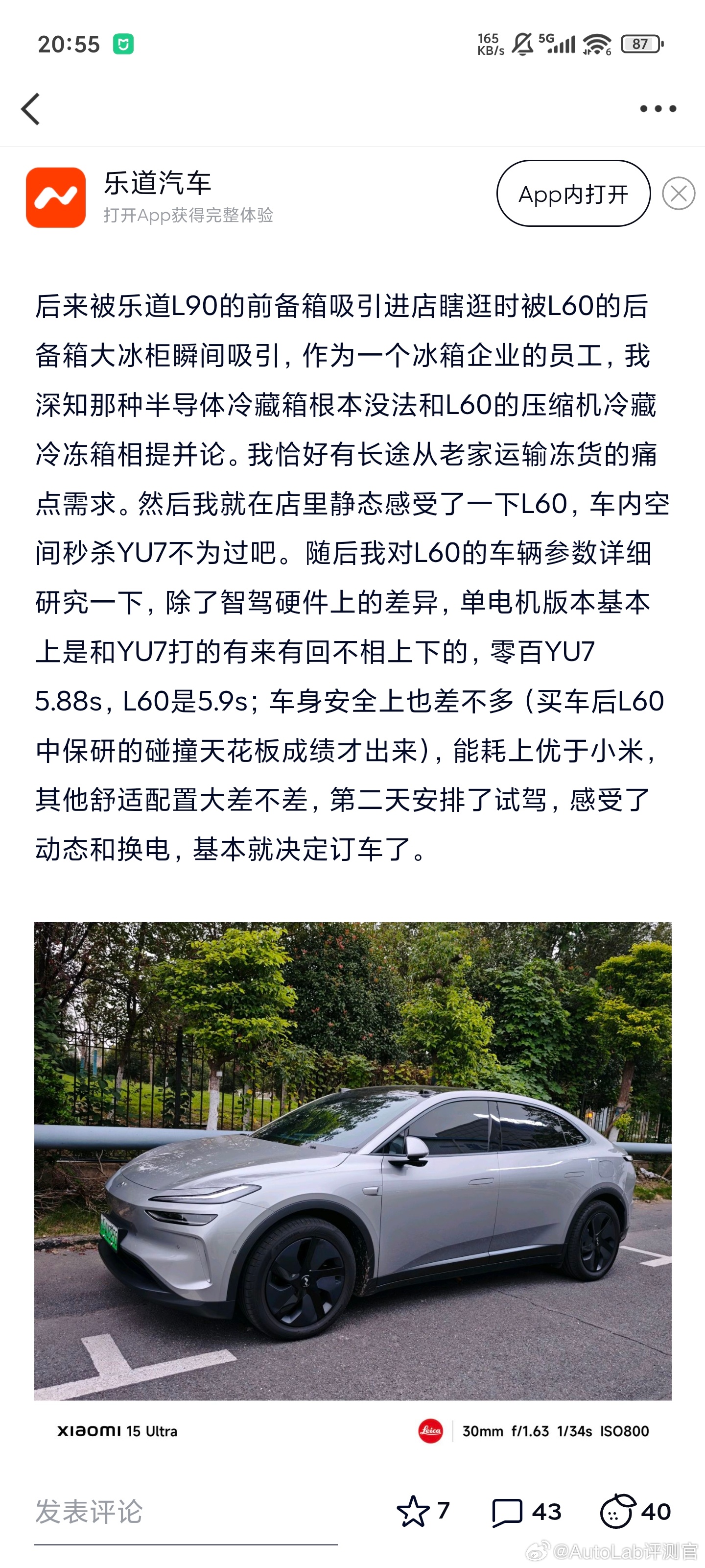 15年纯米粉放弃小米YU7选择乐道L60,原因是空间小
