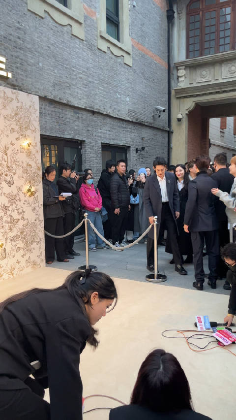 于适今日品牌活动穿了深色大衣外套、西裤搭配白衬衫……
