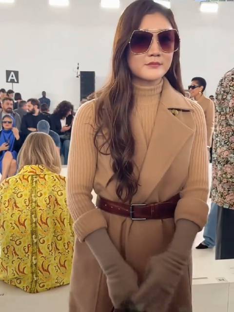 身着品牌经典驼色羊绒大衣的陈梦,妥妥的时尚女王