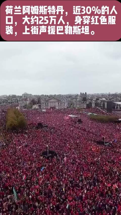 阿姆斯特丹近 30% 的人口(约 25 万人)身穿红色服装走上街头,声援巴勒斯坦
